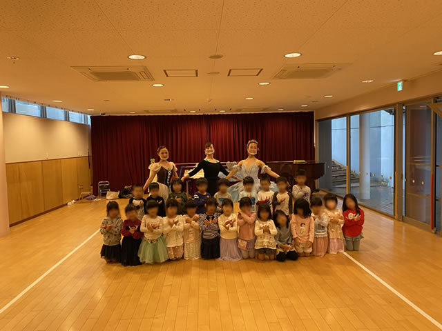 バーレッスンやヴァリエーションを見てもらったり、一緒にバレエのポジションやプリエ、ダンジュなど基本の動きを体験。最後はくるみ割り人形のロシアの踊りをみんなで踊って、ルベランスでおしまいです。